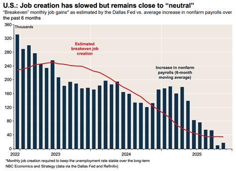 That said, beneath the surface, the labour market has begun to show signs of fatigue. Job creation has slowed meaningfully, particularly among small and mid-sized businesses, and the unemployment rate has edged higher from its cycle lows. Measures such as the quit rate and hiring intentions suggest workers are becoming less confident in their ability to change jobs, a typical late-cycle signal. While layoffs remain contained and job growth is still close to levels needed to keep unemployment stable, the trend points toward easing labour market conditions rather than continued tightening.