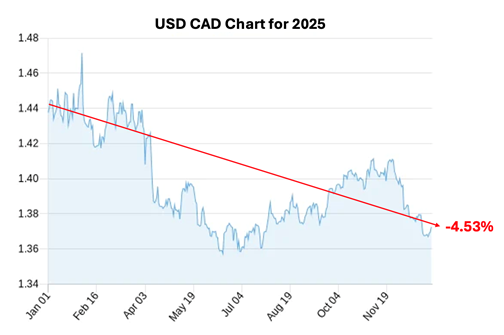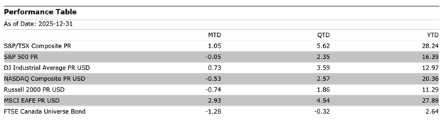 Currency markets were relatively subdued in December, but currency movements were a meaningful factor for investors over the full year. The Canadian dollar found support from strength in commodity prices, while the U.S. dollar weakened against the loonie, declining approximately 4.5% over 2025. This created a notable headwind for Canadian investors holding U.S. assets, as currency translation reduced reported returns despite strong underlying equity performance. While this dynamic understated the fundamental performance of U.S.-based investments within globally diversified portfolios, it also reinforces the importance of currency exposure as a key driver of outcomes, particularly in years marked by significant foreign exchange shifts.