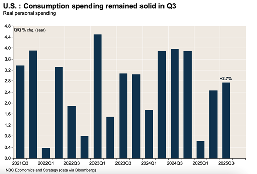 Looking ahead, the U.S. economy is expected to slow modestly but avoid a sharp downturn. However, strong economic fundamentals do not preclude periods of market volatility or correction, particularly with valuations elevated and equity market leadership increasingly concentrated. This dynamic reinforces the importance of distinguishing between economic strength and market risk as we move into 2026.
