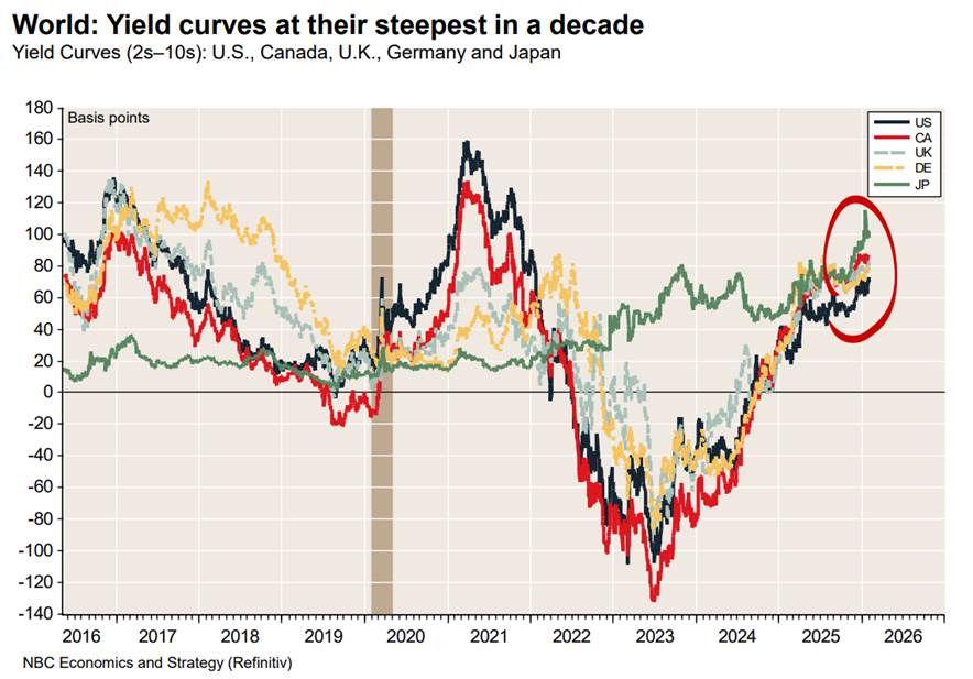 Yield curves across major economies have steepened to their highest levels in more than a decade, reflecting expectations that policy rates may decline modestly while longer-term growth and inflation expectations remain elevated. This dynamic has contributed to increased volatility in bond markets but has also improved income opportunities for fixed income investors.