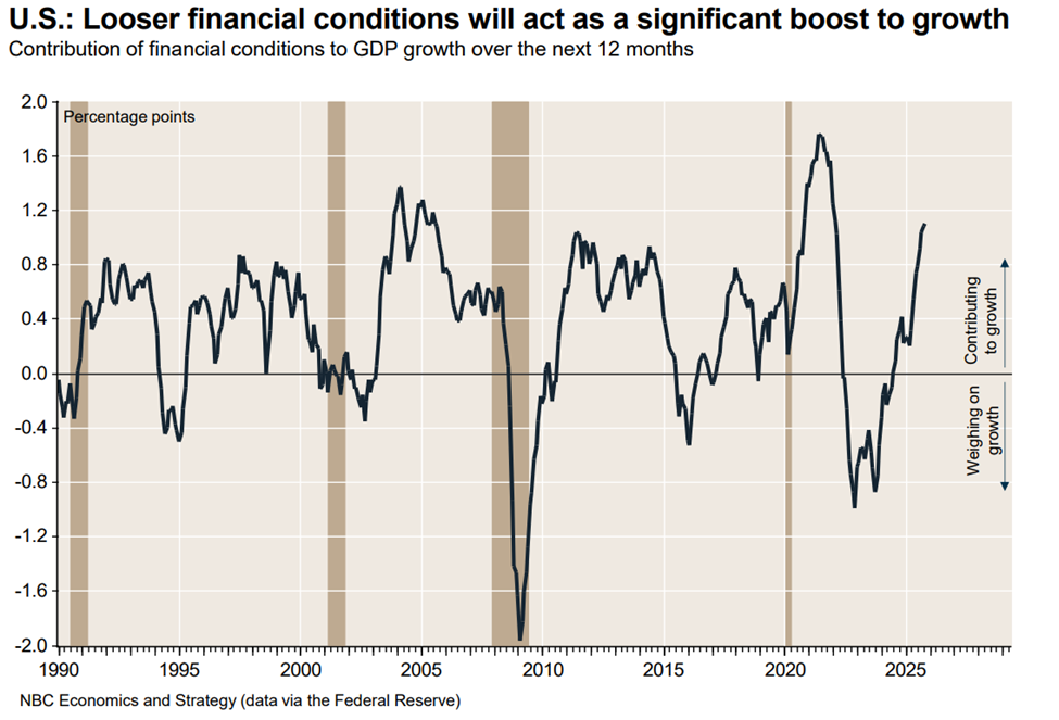 Looking ahead, the United States is expected to maintain solid economic growth in 2026. Although inflation may remain above the Federal Reserve’s target for longer than markets anticipate, looser financial conditions can acts also as a significant boost to growth.