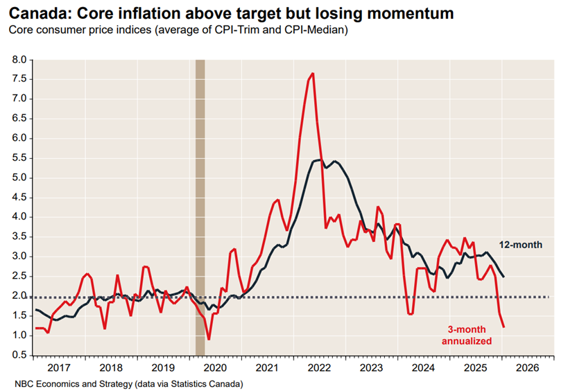 Despite these headwinds, the labour market has shown surprising resilience. The unemployment rate declined earlier this year as labour force participation fell sharply, although this improvement may prove temporary as participation rates normalize. At the same time, wage growth has moderated significantly, helping ease inflationary pressures and providing the Bank of Canada with greater flexibility should economic conditions deteriorate.
