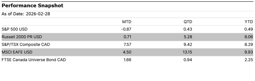 March 06, 2026 • 6 MIN READGlobal markets continued their strong start to 2026, building on the powerful rally seen in 2025. Despite growing geopolitical tensions and the expansion of protectionist trade policies, equity markets have remained resilient. Investors appear increasingly focused on earnings growth expectations and supportive financial conditions rather than trade frictions. While market leadership has begun to broaden beyond the large technology companies that dominated the previous cycle, elevated valuations and shifting macro conditions continue to suggest a more balanced and potentially volatile environment ahead.
