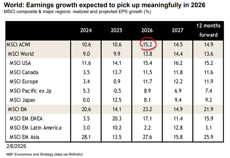 Globally, earnings expectations remain optimistic. Consensus forecasts suggest global earnings growth could accelerate in 2026, driven by productivity gains from technological adoption, fiscal stimulus across several regions, and stronger commodity prices. However, these projections leave limited room for disappointment should economic growth slow or profit margins fail to expand as expected.