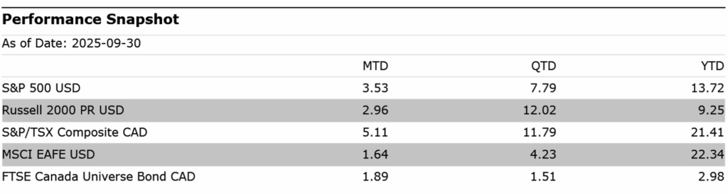 October 08, 2025 • 5 MIN READSeptember 2025 marked the close of a remarkably strong quarter for financial markets, with equities rallying globally despite the backdrop of rising trade tensions, sticky inflation, and diverging central bank actions. The S&P/TSX reached a new record high, powered by surging gold stocks, while U.S. and emerging market equities posted broad gains. Central banks in both Canada and the U.S. pivoted toward easing, offering modest support. Yet under the surface, the economic narrative remains mixed: labour markets are softening, and the divergence between Canada and the U.S. appears to be widening as Canada grapples with contraction while U.S. growth remains resilient.