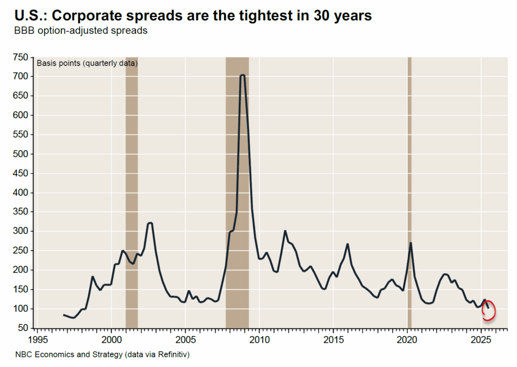 Credit spreads remain tight, particularly in the U.S., where BBB spreads are at 30-year lows, suggesting little pricing for risk.