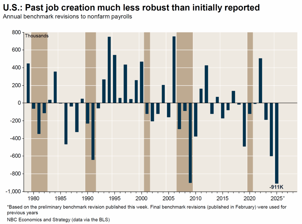The most notable shift in September wasn’t a headline print—it was the revision of past jobs data. The Bureau of Labor Statistics announced that U.S. payroll growth had been overstated by 911,000 jobs, the largest downward revision on record.
