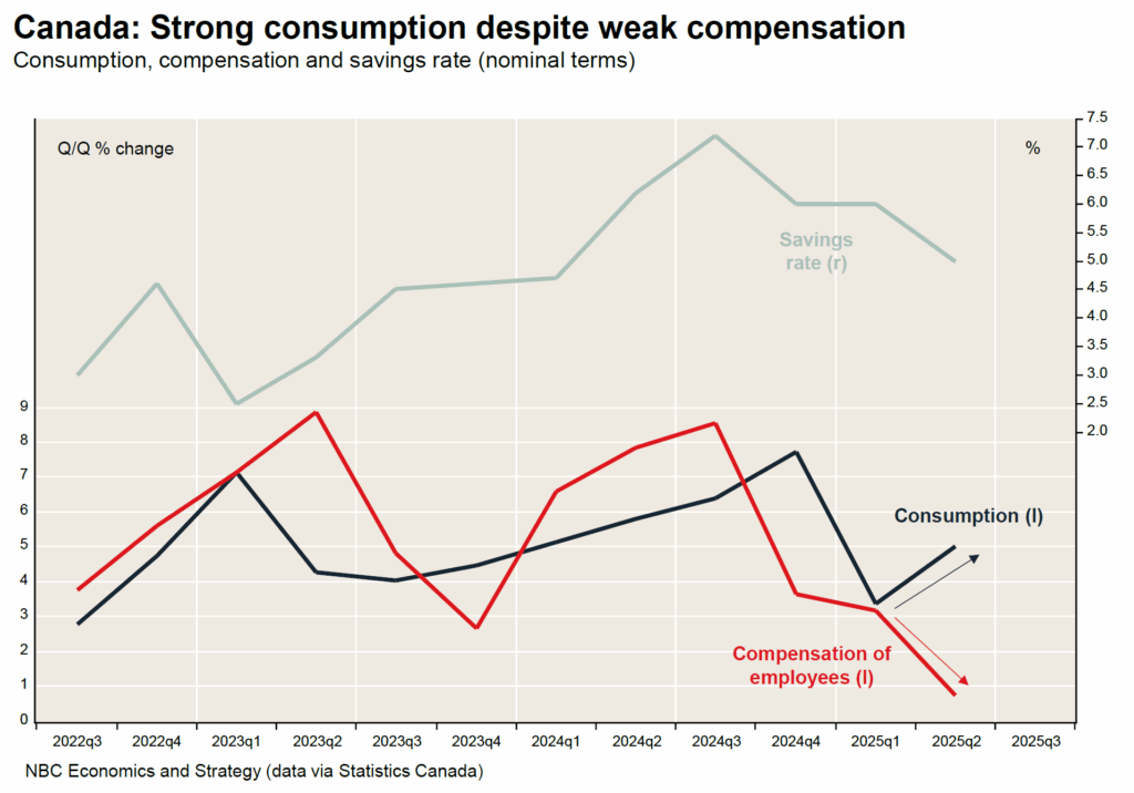 One bright spot: consumer spending, which rose 4.5% annualized last quarter. But before we celebrate this, it’s worth noting that the forward outlook is less encouraging, especially given that this surge came at the expense of household savings, which have declined across Canada. This raises concerns about the sustainability of spending and the broader economic resilience ahead.