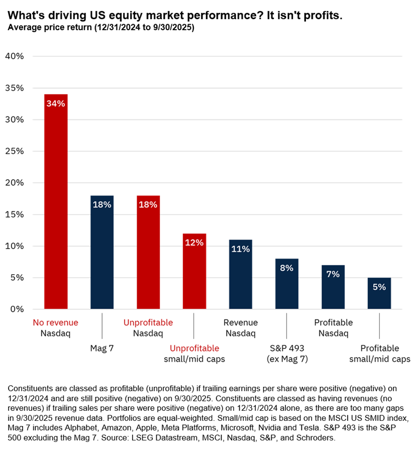 A small group of companies is driving a large share of market returns. Investors are placing more emphasis on long-term growth potential and less on near-term profits. As a result, quality stocks have once again fallen behind.