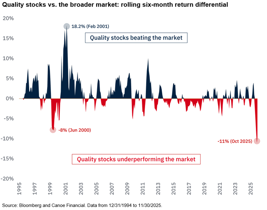 The recent gap between quality and the broader market has reached levels that historically coincided with important turning points. That does not mean a reversal is imminent.